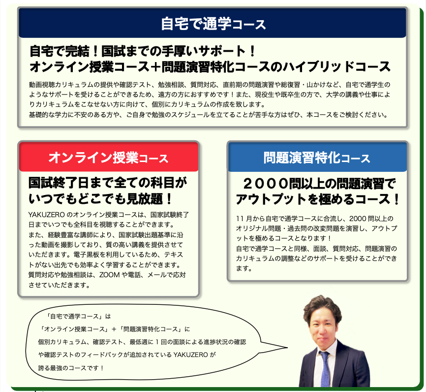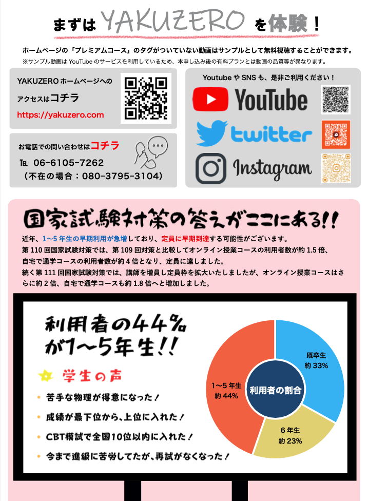 さらに国家試験対策、CBT対策をしたい方には通学プランまたはオンラインプランに入会していただき、合格を確固たるものにしましょう。ZOOMや電話でのご相談も承っておりますので、お問い合わせよりご連絡ください。